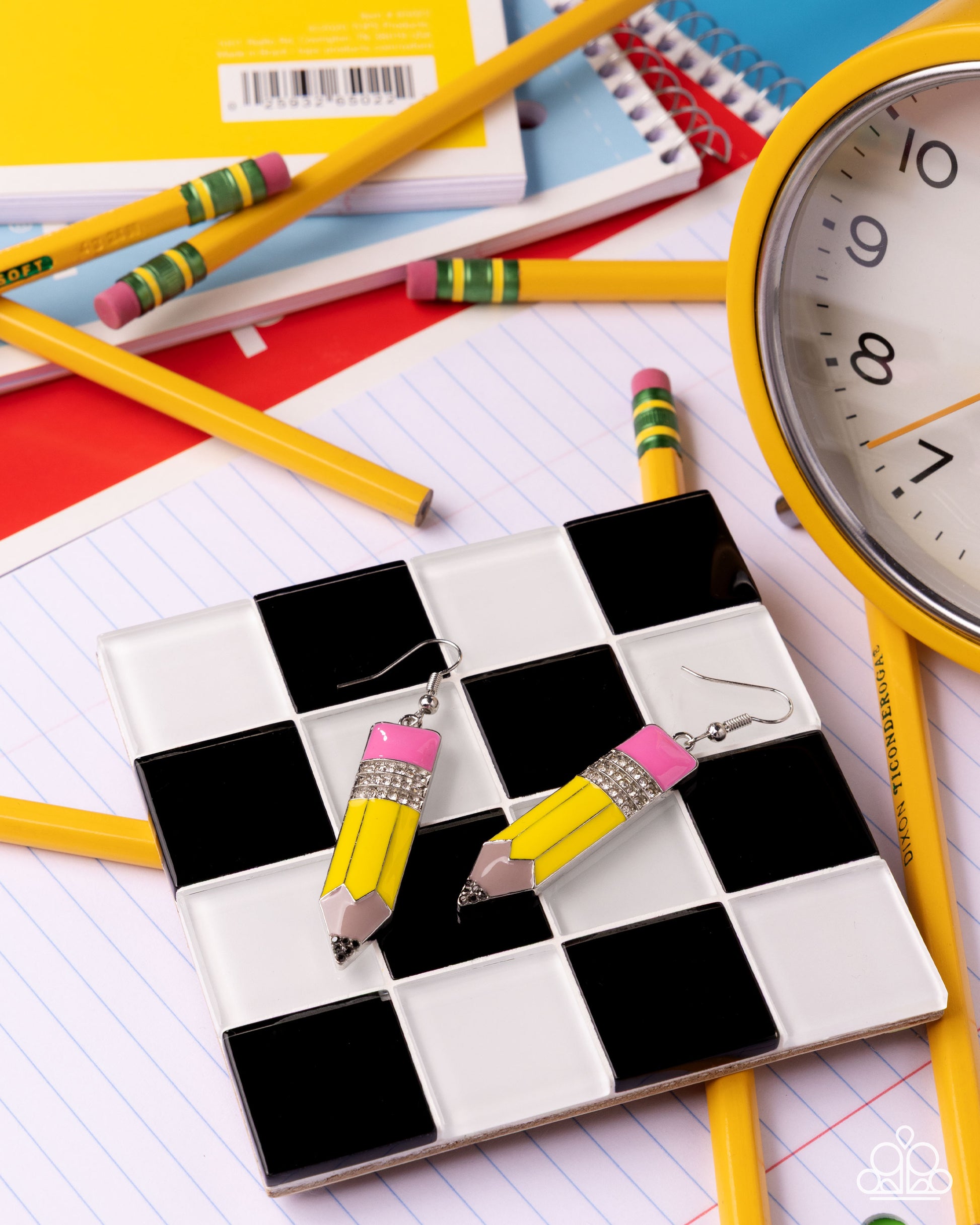 Featuring a Desert Rose eraser, row after row of white rhinestones, a yellow pencil, and a hematite rhinestone tip, a glistening silver pencil swings below the ear for a blingy back-to-school statement. Earring attaches to a standard fishhook fitting.