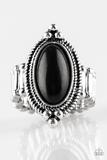 Chiseled into an alluring oval, a smooth black stone is pressed into a textured silver frame dotted with silver studs for a seasonal look. Features a stretchy band for a flexible fit.