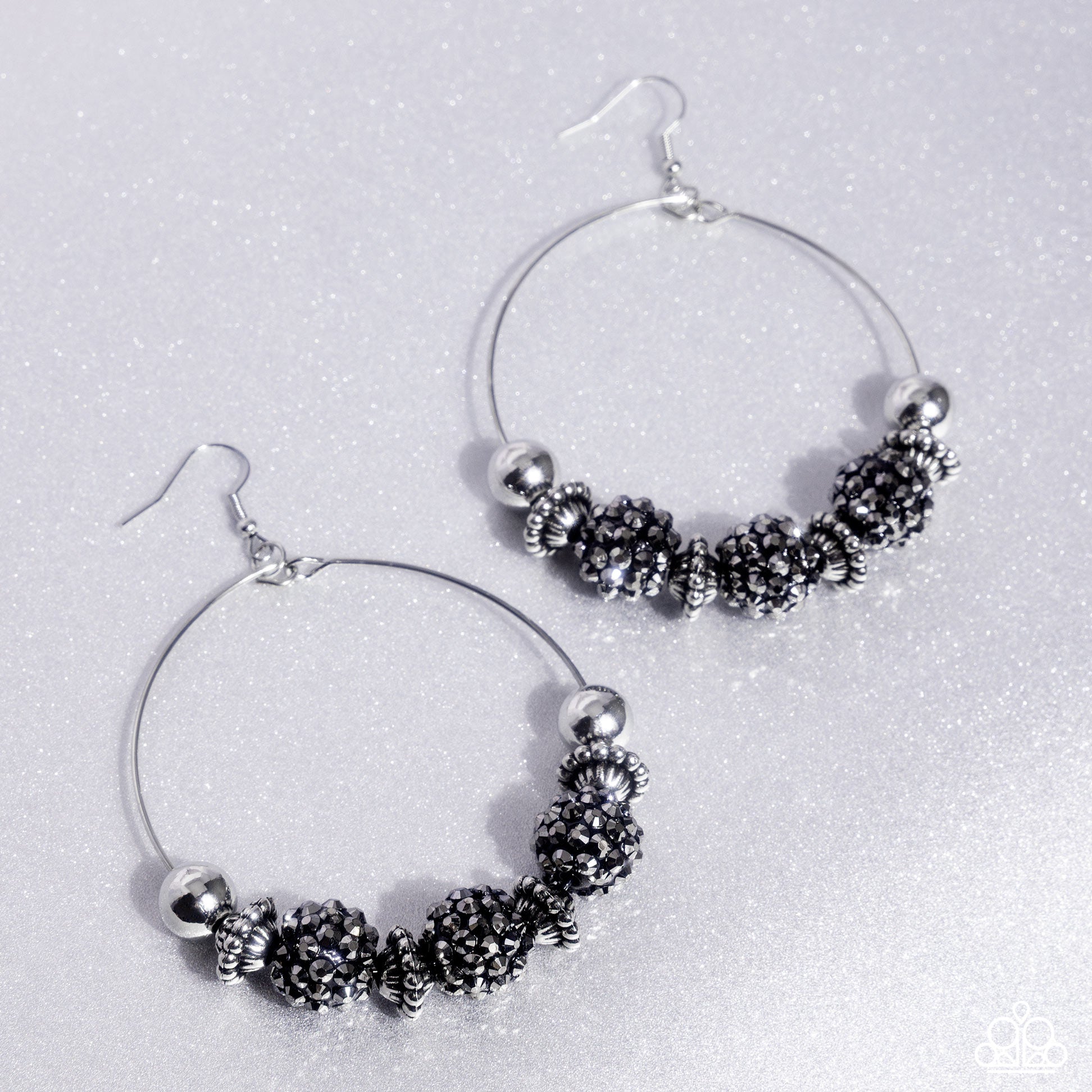 A stunning array of studded silver accents, oversized silver beads, and hematite rhinestone encrusted black beads are threaded along a dainty silver wire hoop, resulting in a dazzling pop of color. Earring attaches to a standard fishhook fitting.