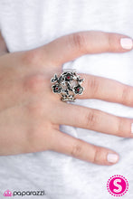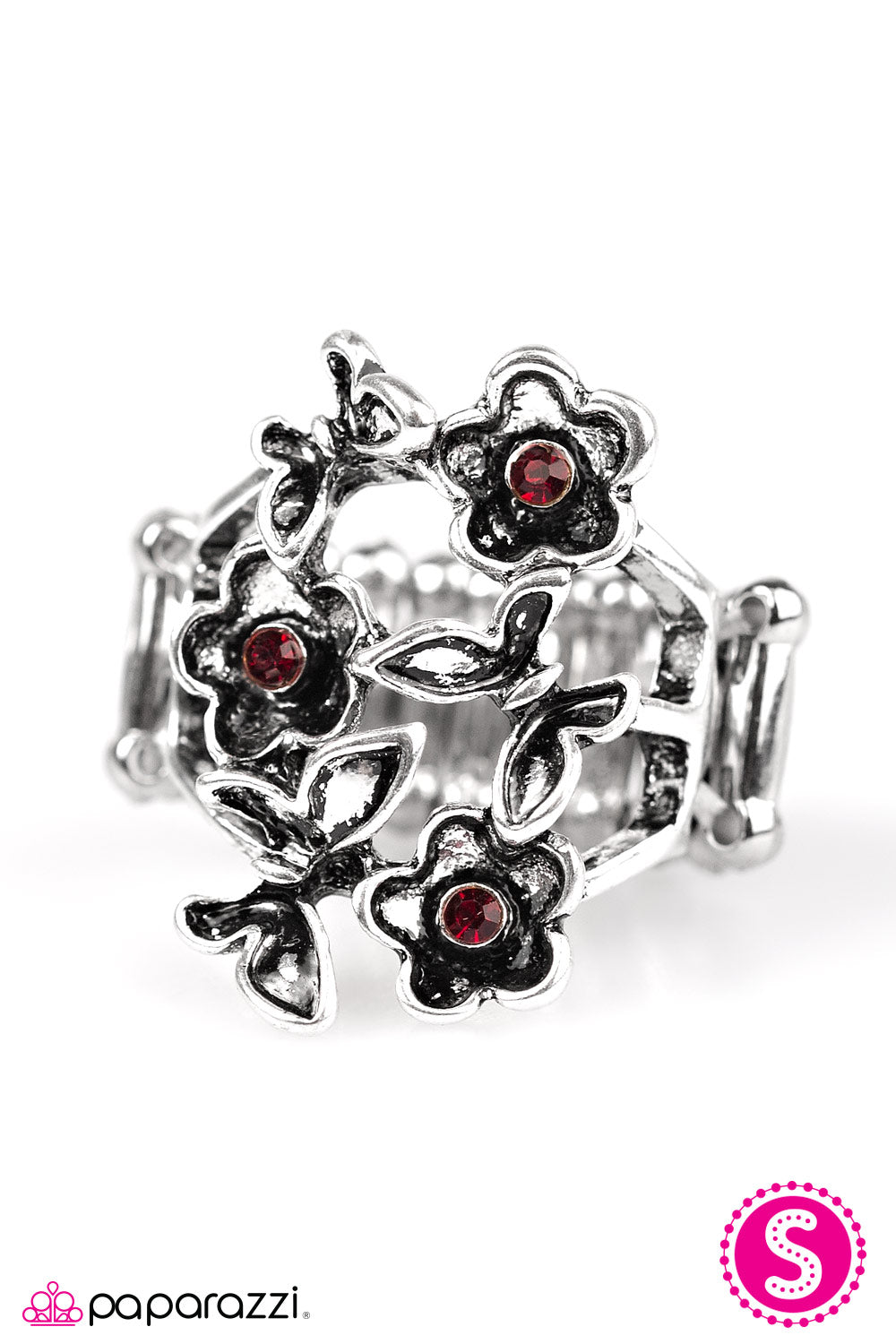 Brushed in an antiqued shimmer, silver flowers and butterflies swoop across the finger, creating a whimsical bouquet. Glittery red rhinestones are sprinkled across the floral centers for a colorful finish.