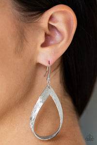 Scratched in shimmery textures, a glistening silver ribbon loops into a refined lure. Earring attaches to a standard fishhook fitting.