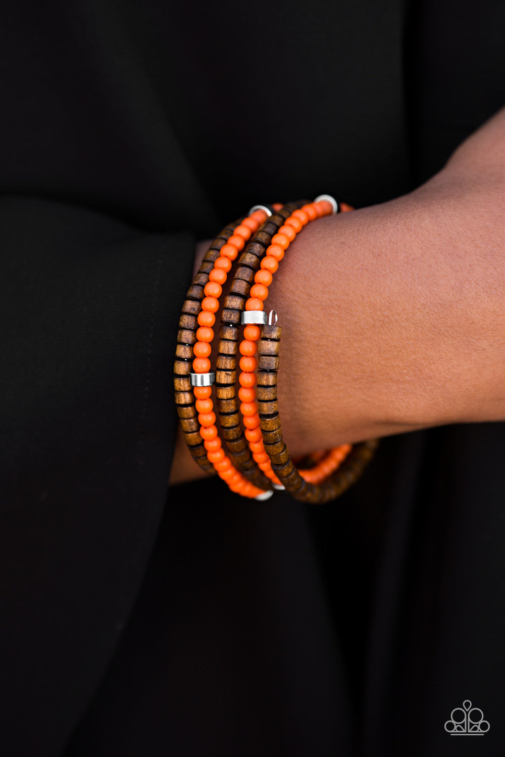 Vivacious orange beads and dainty wooden accents alternate along a coiled wire to create an earthy infinity wrap style bracelet.