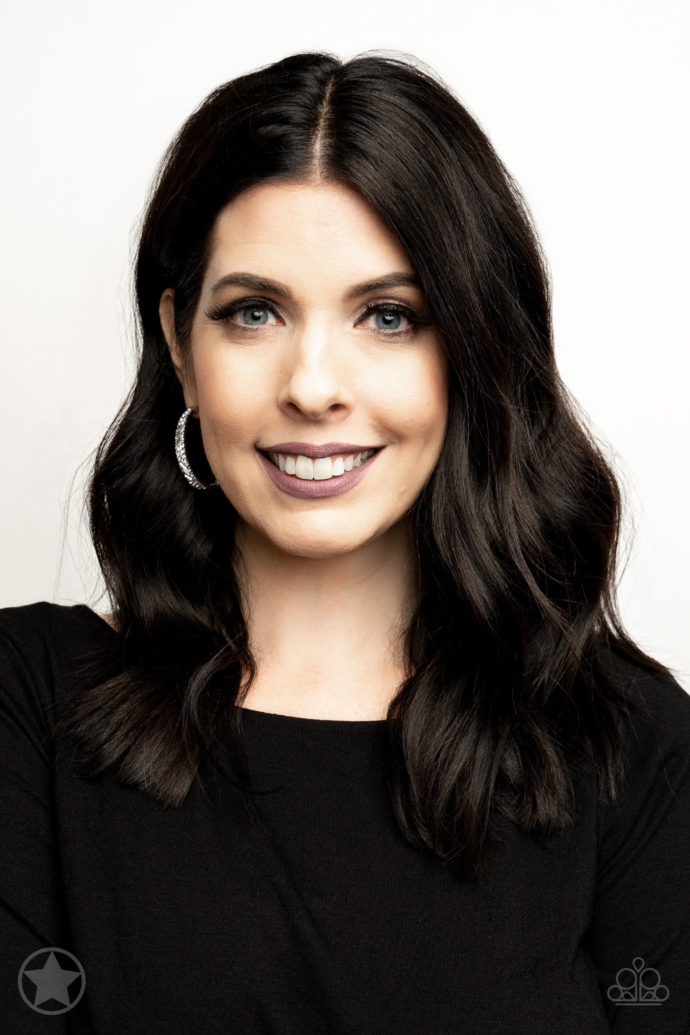 The front facing surface of a chunky hoop is dipped in brilliantly sparkling rhinestones while light-catching texture wraps around the back. The interior of the hoop features the opposite pattern, creating the illusion of a full hoop of blinding rhinestones. Earring attaches to a standard post fitting. Hoop measures 1 3/4" in diameter.