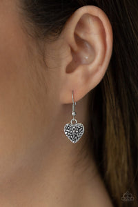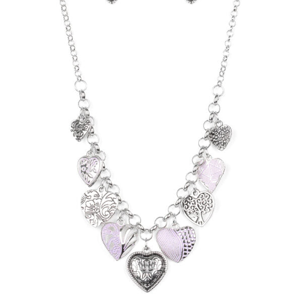 Featuring an array of floral patterns, a collection of silver hearts swings from the bottom of a shimmery silver chain. Alternating charms are brushed in a finish, creating a colorful fringe below the collar. Features an adjustable clasp closure.