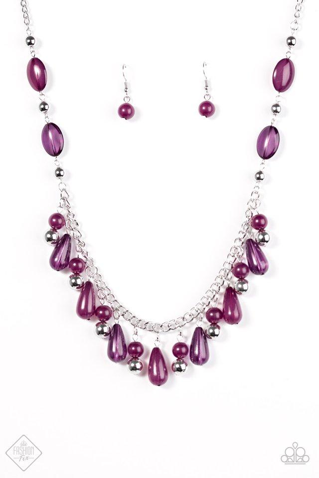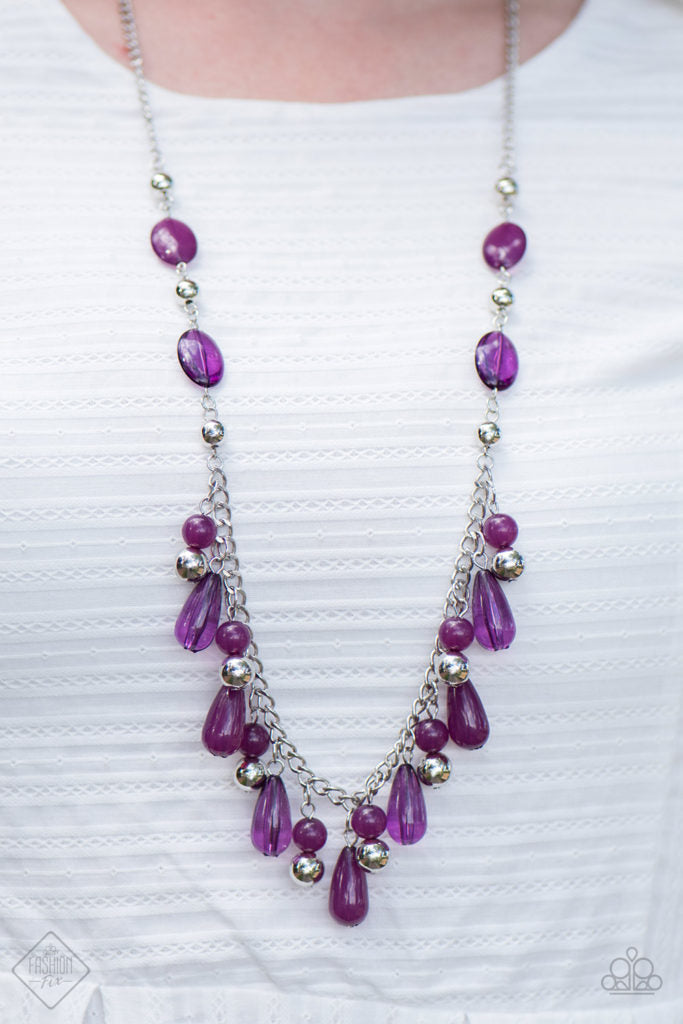Featuring translucent and opaque shimmer, an array of purple beads trickles down a shimmery silver chain for a whimsical look. Shiny silver beads are sprinkled between the colorful accents, adding classic shimmer to the seasonal palette. Features an adjustable clasp closure.