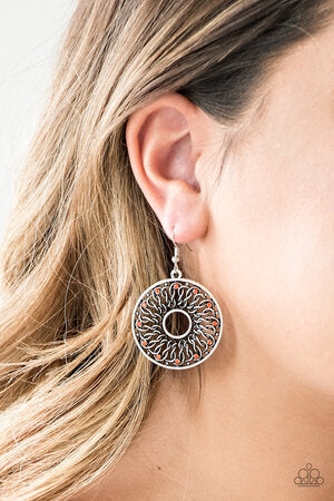 Dotted in dainty orange rhinestones, glistening silver wires twist and interlock inside of a shimmery silver hoop for a whimsical look. Earring attaches to a standard fishhook fitting.