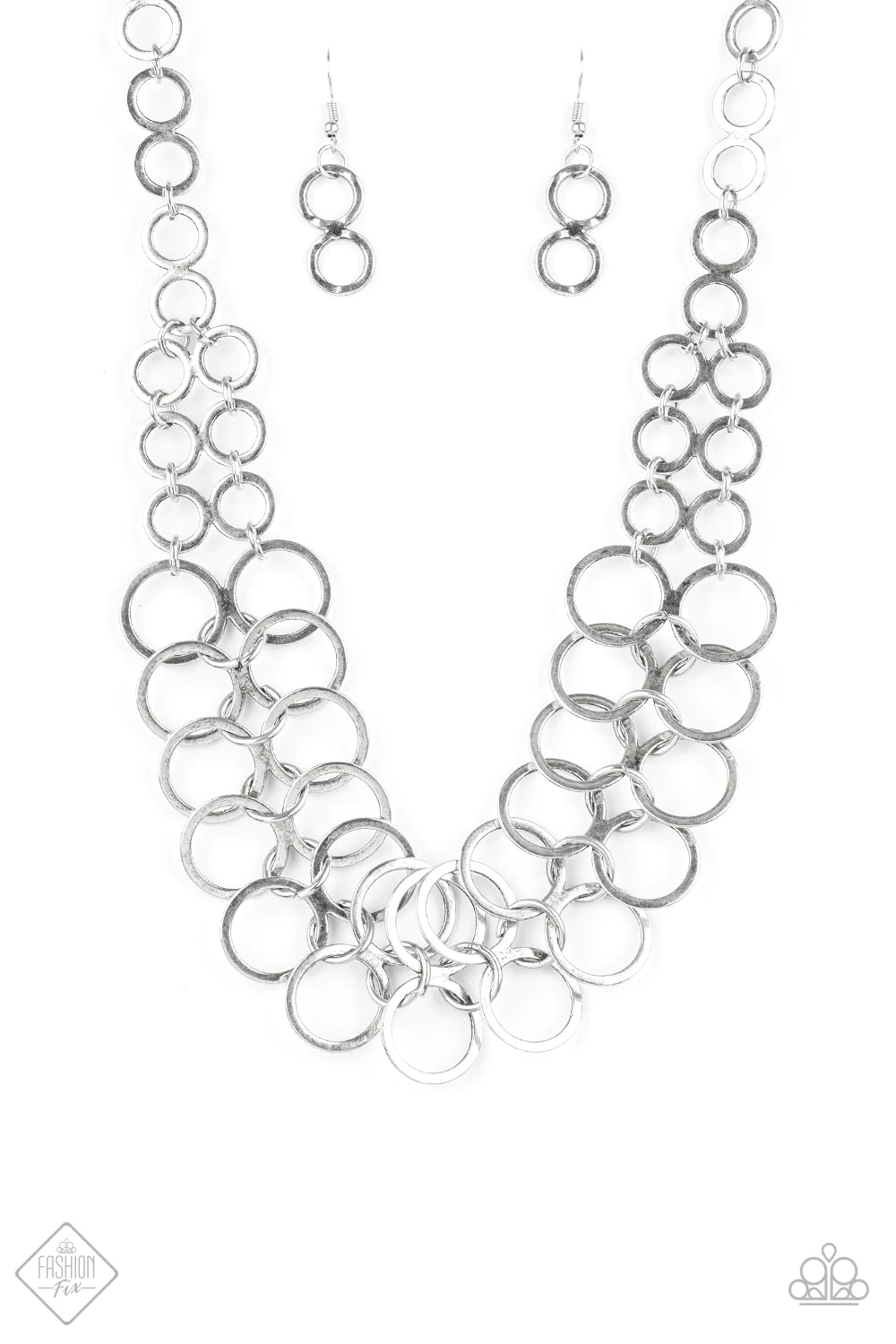 Gradually increasing in size near the center, double-linked silver rings connect below the collar in a dramatic industrial fashion. Features an adjustable clasp closure.