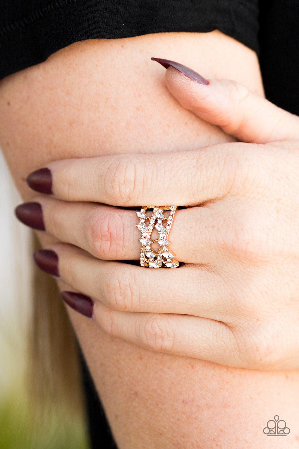 Featuring regal marquise style cuts, glittery white gems crisscross over gold bars encrusted in classic white rhinestones for a timeless look. Features a stretchy band for a flexible fit.