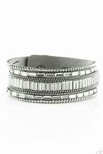 Featuring classic round and edgy emerald style cuts, glittery hematite and smoky rhinestones are encrusted along bands of suede for a sassy look. Features an adjustable snap closure.