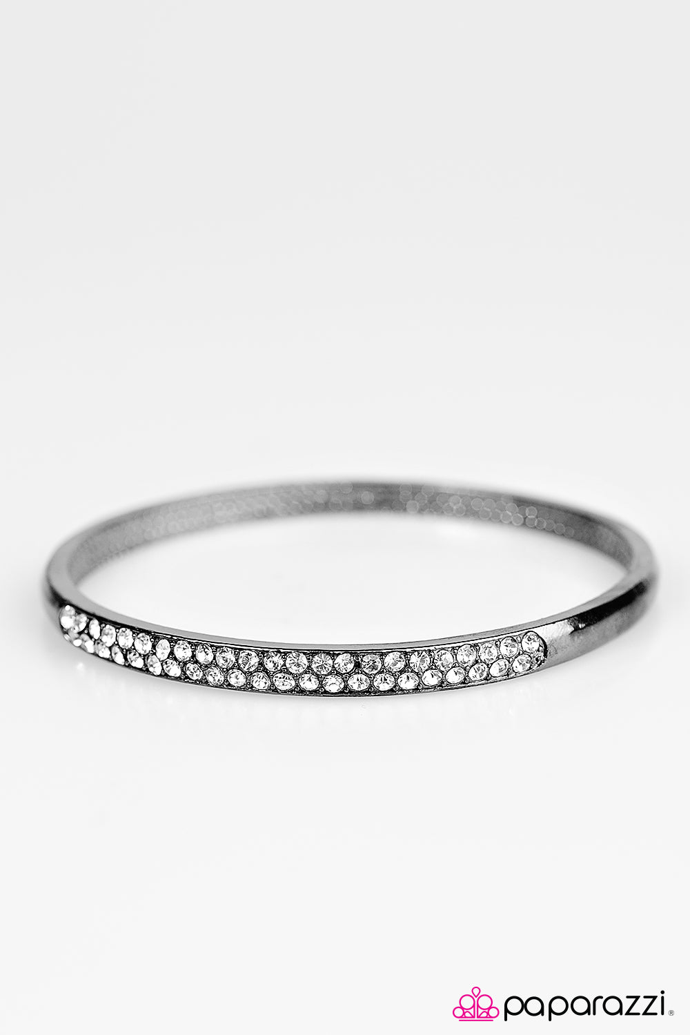 A ribbon of gunmetal circles the wrist, creating a gunmetal bangle. Glittery white rhinestones are encrusted along the top of the frame, adding sparkling accents to the refined palette.