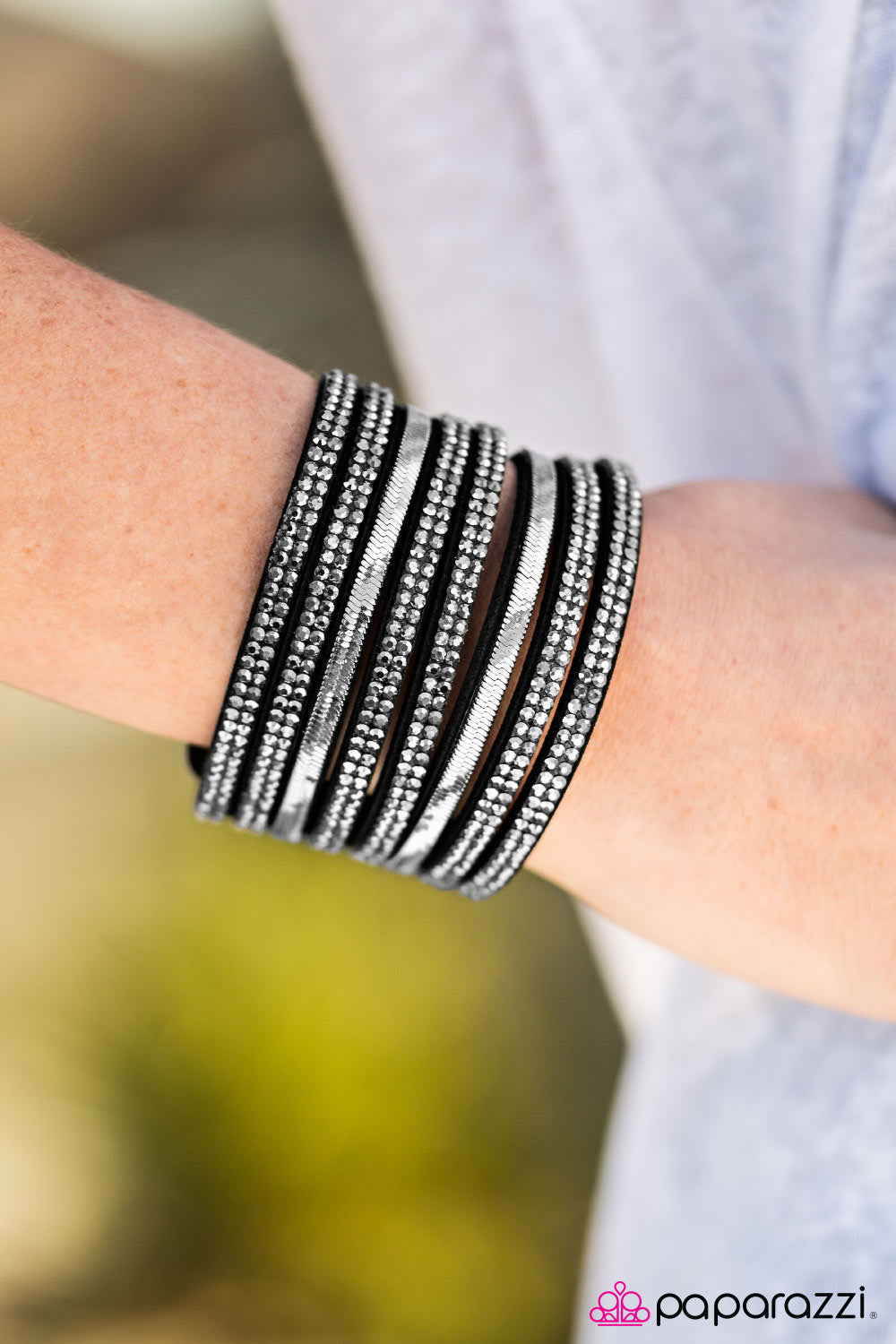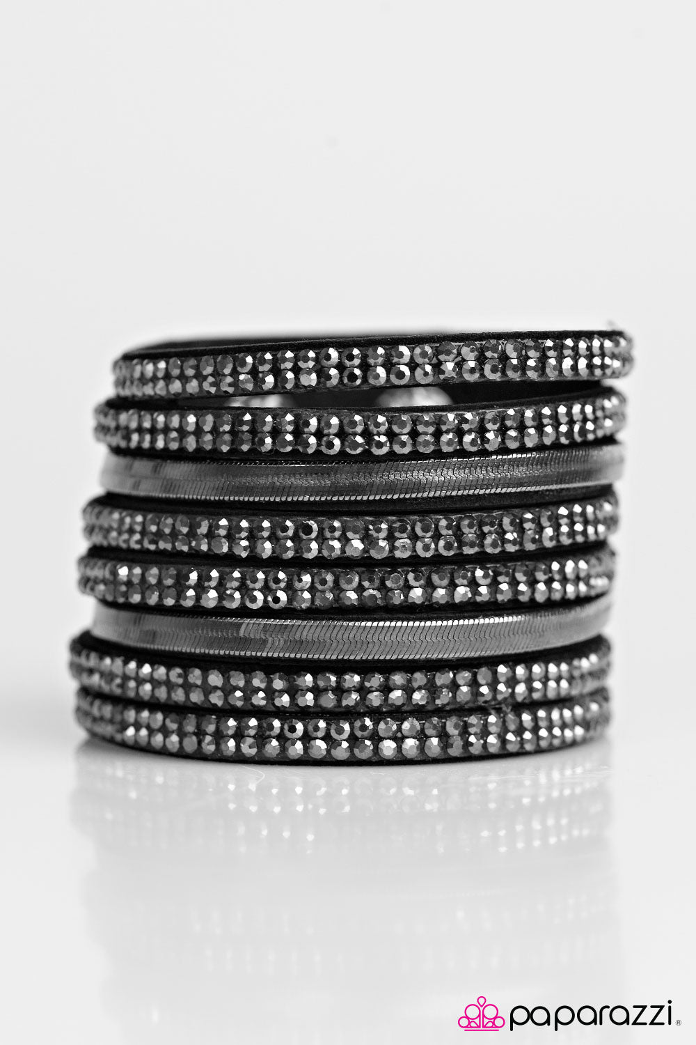 Rows of hematite rhinestones stack across the wrist, creating an undeniable glittery palette. Rows of flat gunmetal chain race between the sparkling strands, adding a flashy metallic finish to the collision of texture. Features an adjustable snap closure.