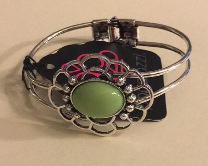A bright green bead embellishes the center of a frilly frame, creating a colorful cuff. Features an adjustable hinged closure.