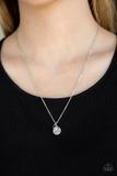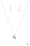 Dotted with a dainty white rhinestone, a shimmery silver disc stamped in the word, "mom", joins a dainty silver heart below the collar for a whimsical look.